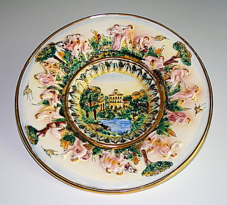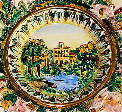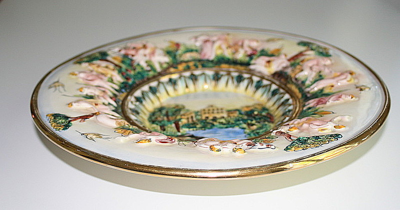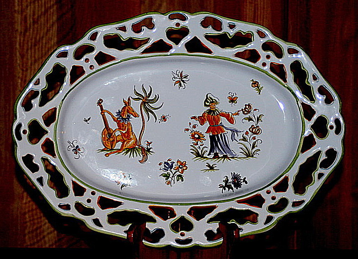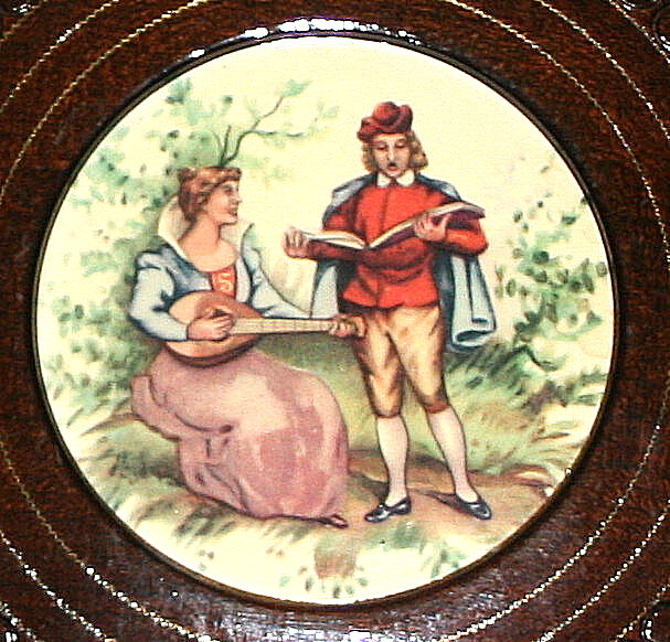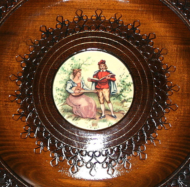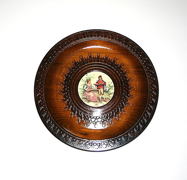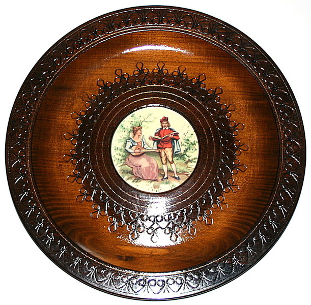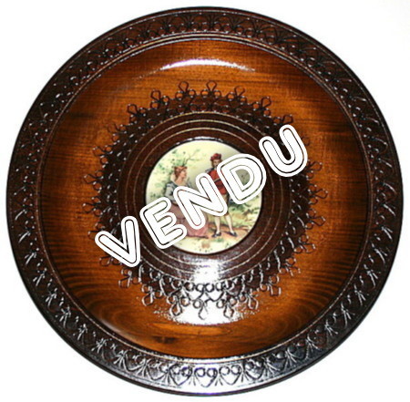 Assiette en bois de YOUGOSLAVIE avec décor romantique.
