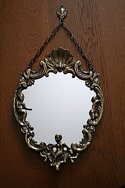 Miroir du XXème (1930/1940) en bronze, joli patine avec décor d'angelot. Rares et original avec sa chaine et sont atache.