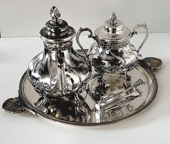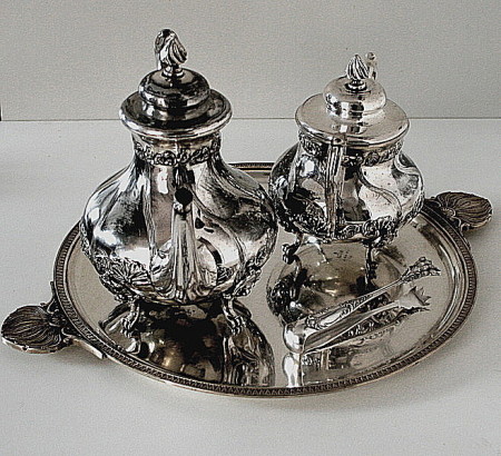 Théière : quadripode de forme néoclassique à décor de coquilles, fleurs, feuillages stylisées et joncs en torsade préfigurant le style Art nouveau.