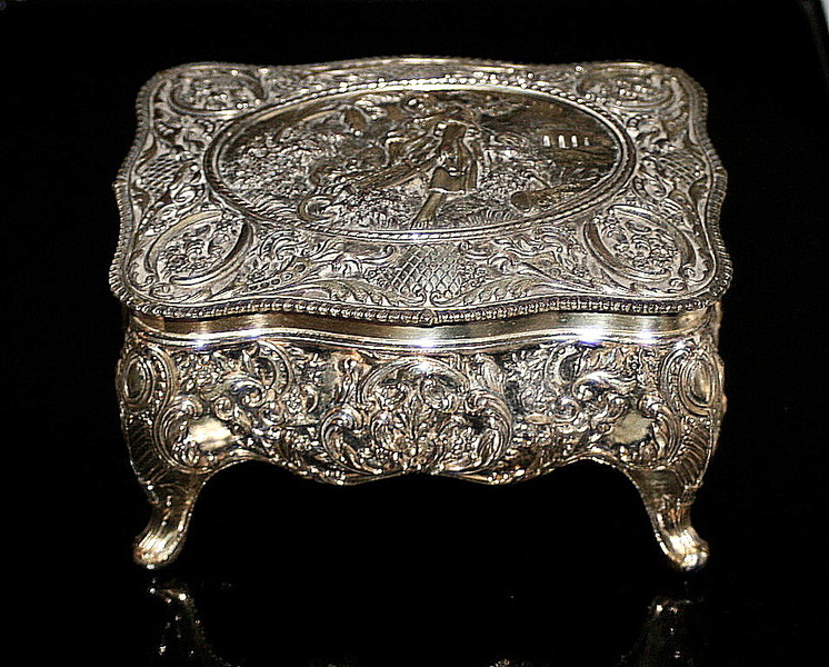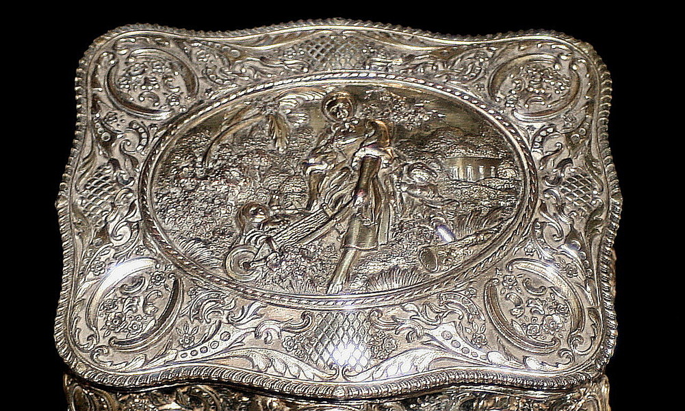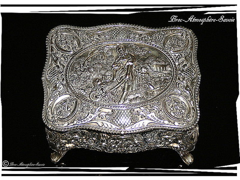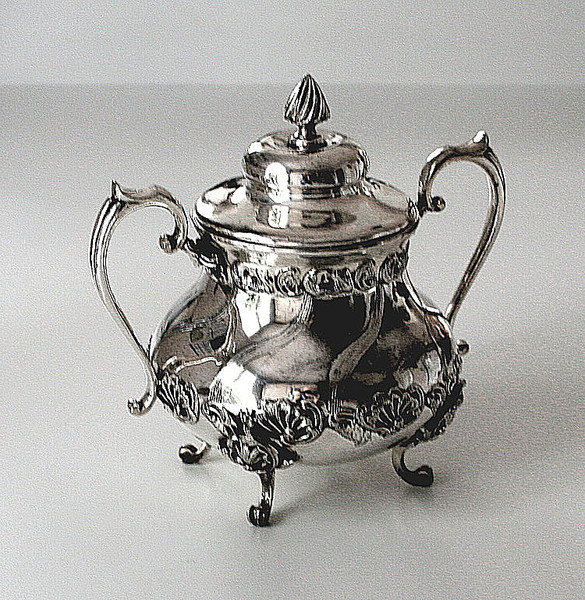 Sucrier : quadripode de forme néoclassique à décor de coquilles, fleurs, feuillages stylisées et joncs en torsade préfigurant le style Art nouveau.