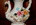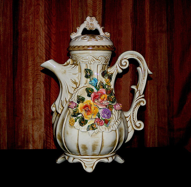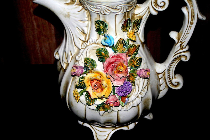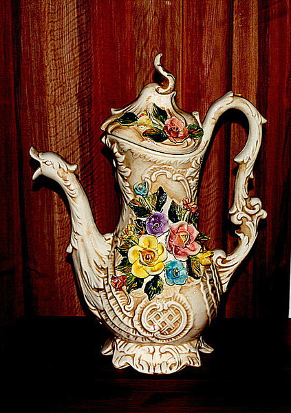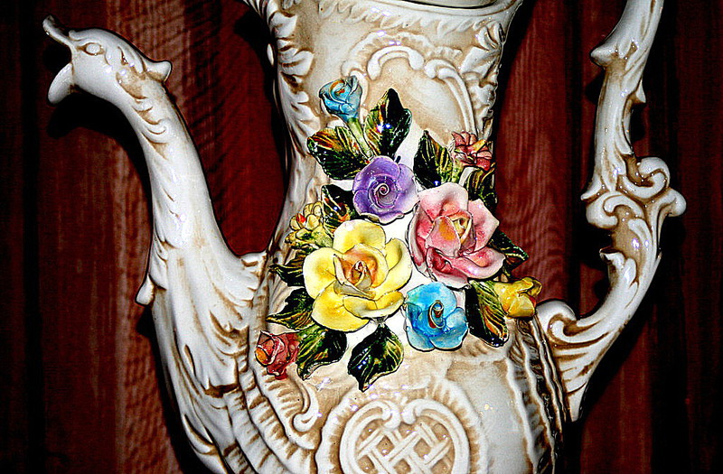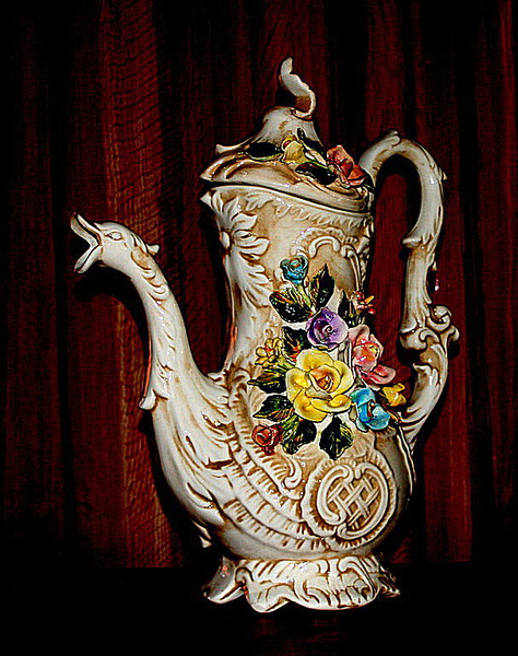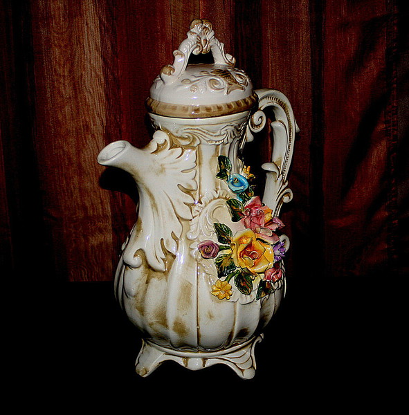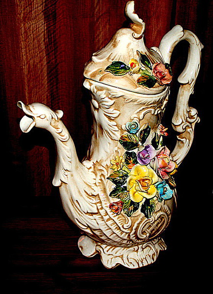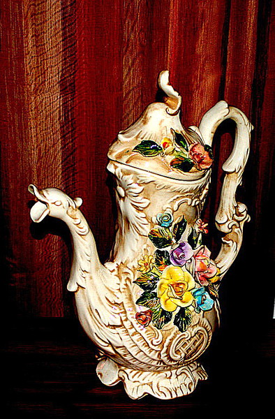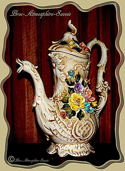Barbotine à décor de fleurs et visages, bec verseur en tête d'oie.