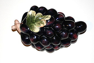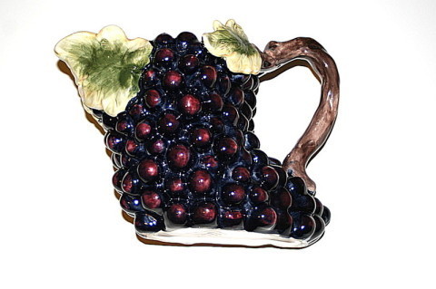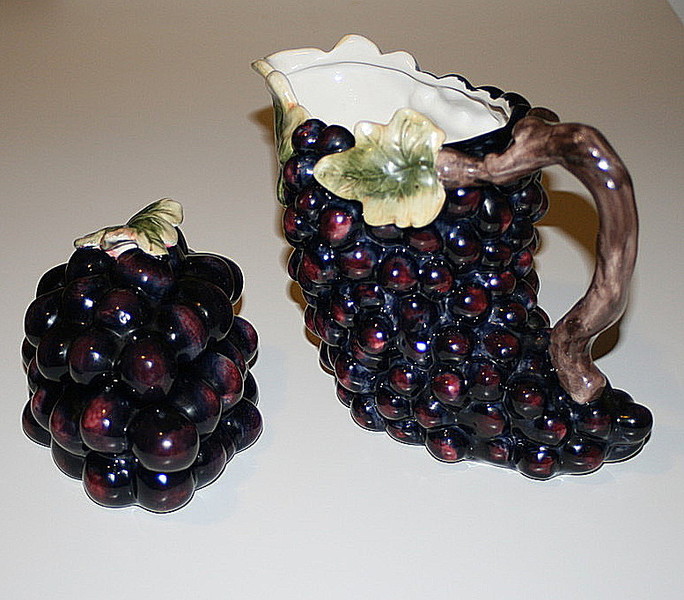 Rare et originale boîte et cruche en faïence forme grappe de raisin.